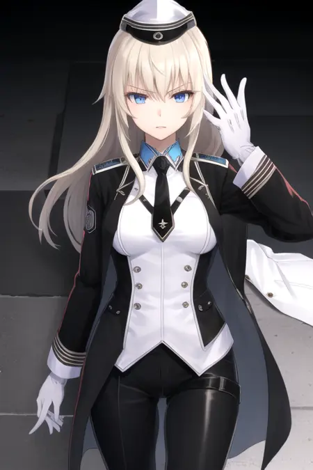 EliseSW, 1girl, solo, long hair, blue eyes, blonde hair, shirt, white gloves, long sleeves, white jacket, black necktie, black pants, white uniform, military uniform, white headwear, emblem, garrison cap