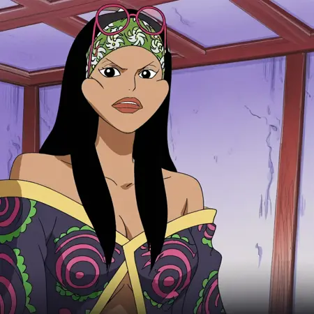 BelladonnaOP, 1girl, solo, black hair, long hair, headband, black eyes, lips, glasses, high cheek bones, cleavage, large breast, blouse, dark skin, panty, shoes, eyewear on head, bare shoulders, navel, midriff, groin, patterns on blouse, wide sleeves, collarbone,