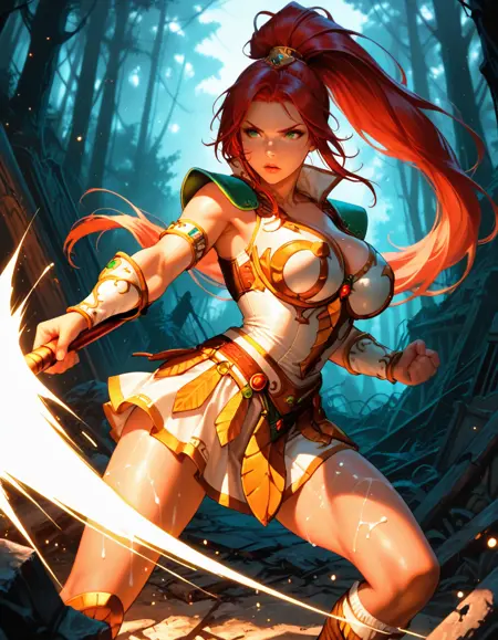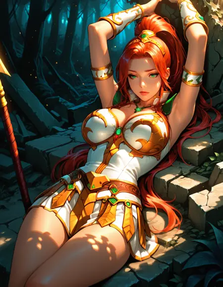 red hair, ponytail, green eyes,