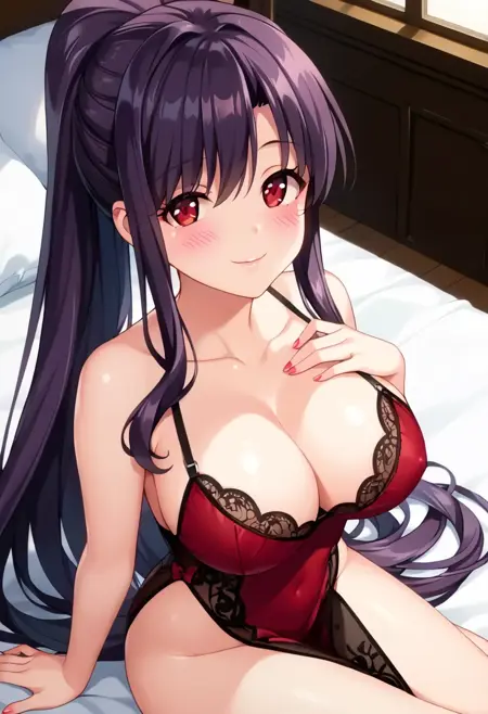 Kitamura Natsuki, long hair, black hair, purple hair, sidelocks, red eyes, ponytail,