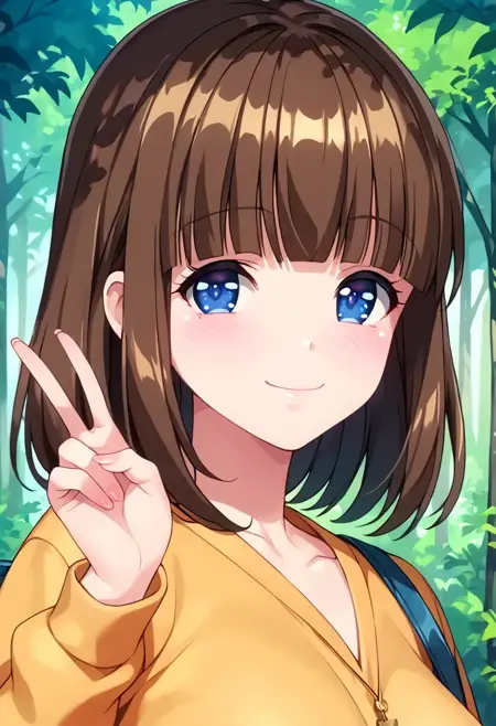 Saionji Tо̄ko, brown hair, blue eyes, blunt bangs, medium hair,