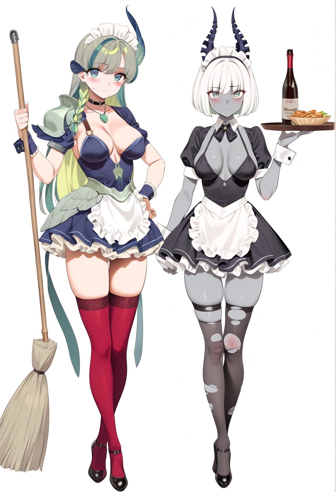 :蓝色眼睛、五彩头发、发辫、头发装饰、项链、短裙、胸部暴露、单肩甲、护手、大腿靴