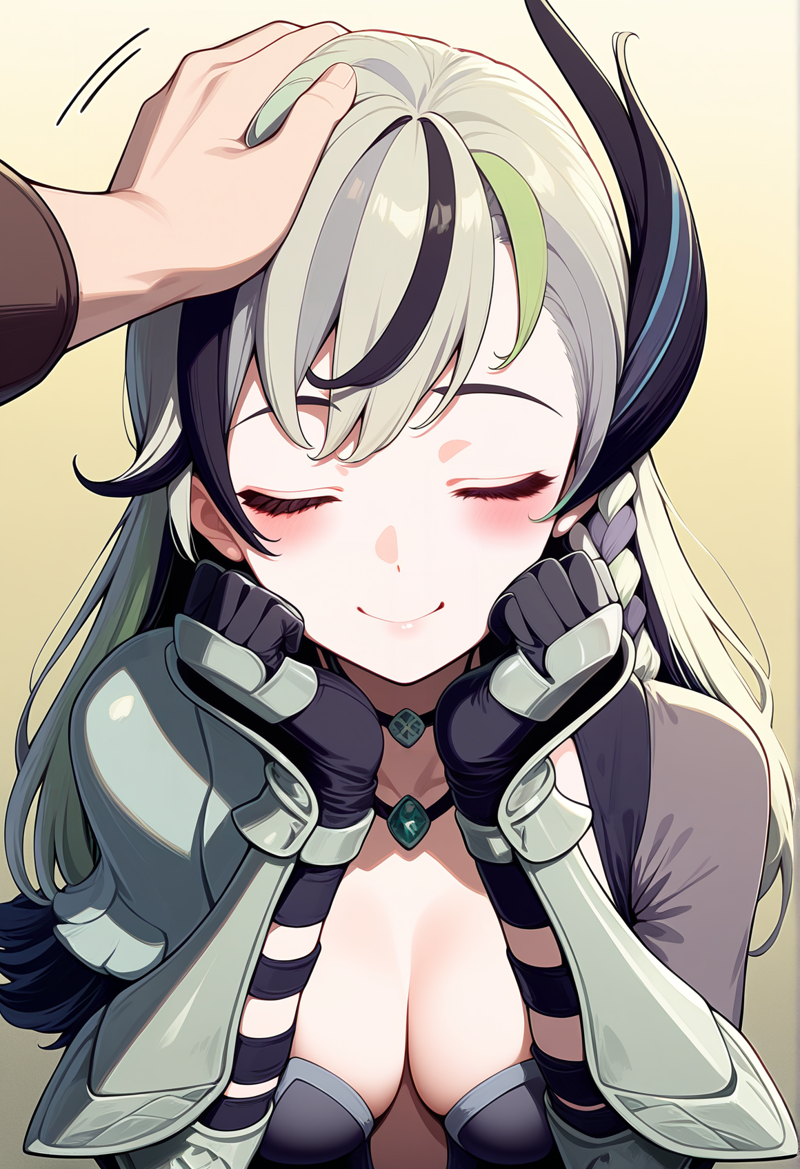 blue eyes, multicolored hair, braid, hair ornament, necklace, short dress, cleavage, single pauldron, gauntlets, thigh boots,