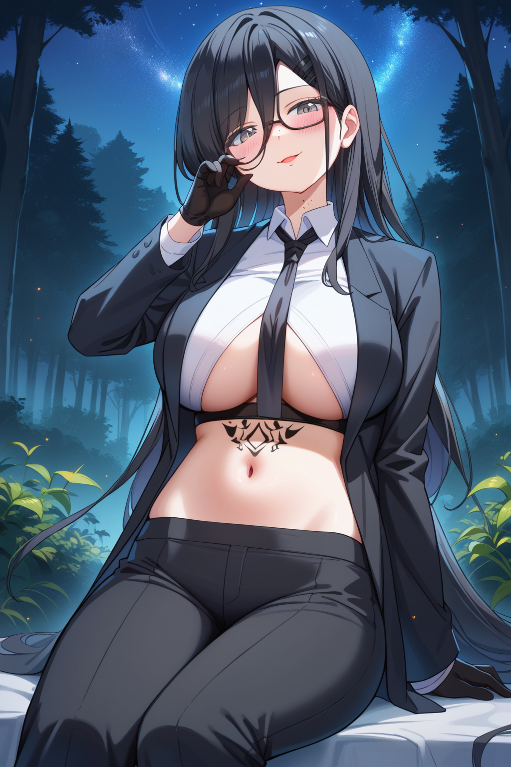 Aristotletgr, 회색 눈, 안경, 두더지, 입 밑 두더지, 검은 머리, 긴 머리, 눈 사이 머리, 머리핀, 셔츠, 칼라 셔츠, 넥타이, 검은 넥타이, 흰 셔츠, 여는 셔츠, 아랫가슴, 문신, 코트, 검은 코트, 여는 코트, 배꼽, 긴 소매, 장갑, 검은 장갑, 바지, 검은 바지