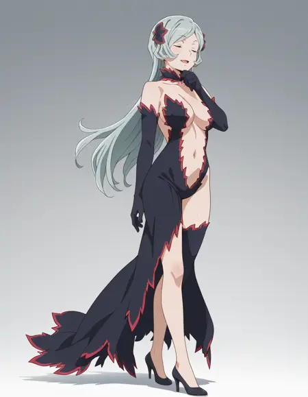 여신 복장, 목걸이, 잠금뼈, 가슴선, 드러난 옷, 검은 드레스, 어깨 노출, 팔꿈치 장갑, 배꼽, 비대칭 허벅지 양말, 하이힐