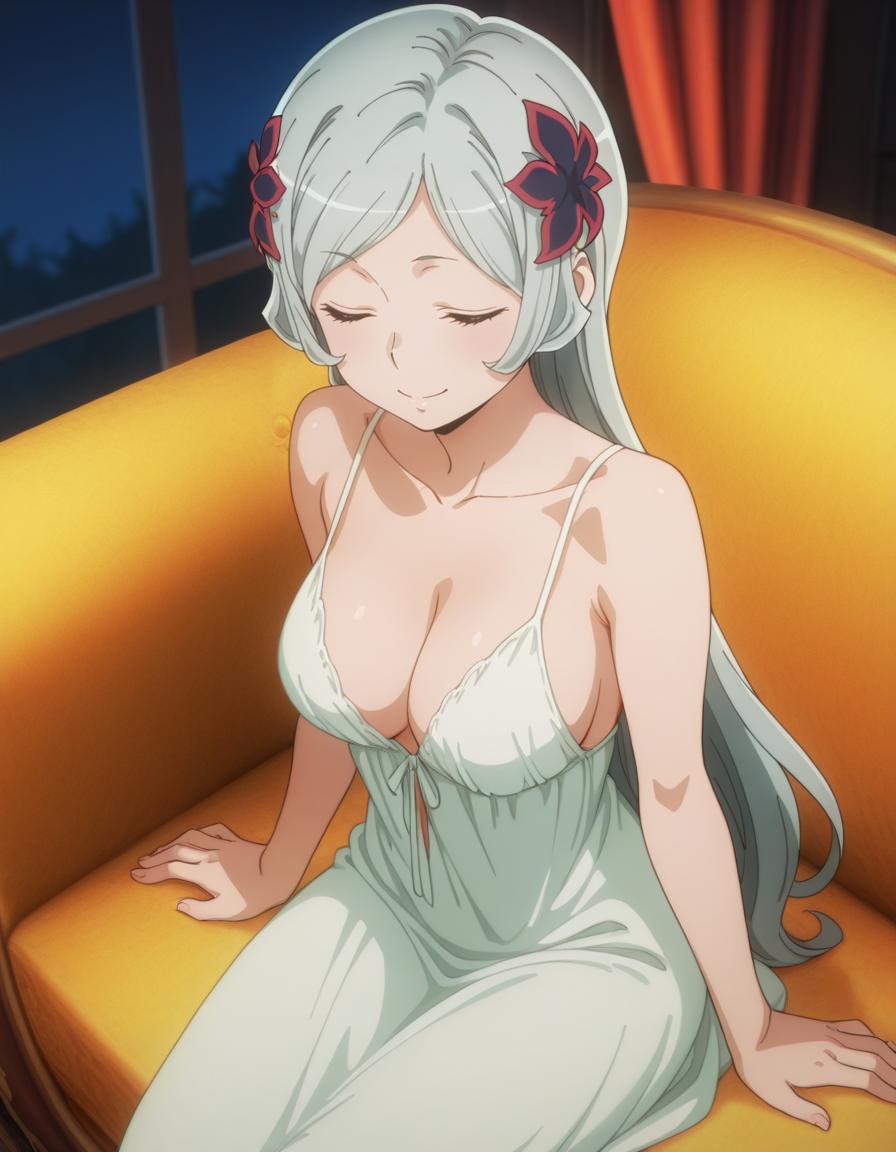 <lora:freya-danmachi_s5-ixl-anime-soralz:1>, freya (danmachi), 긴 머리, 은색 머리, 갈라진 앞머리, 머리 장식, 보라색 눈