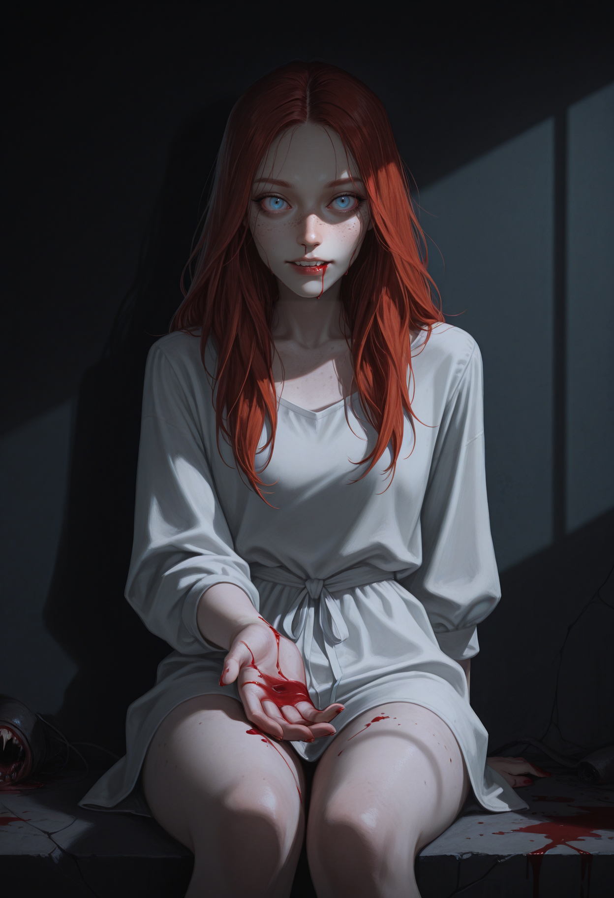recommended tags: 1girl, solo, long hair, red hair, blue eyes, medium breasts,