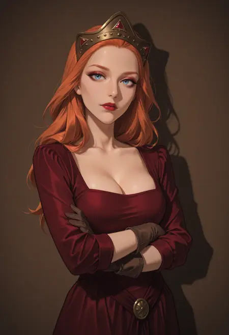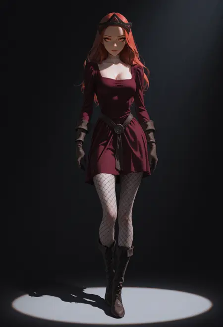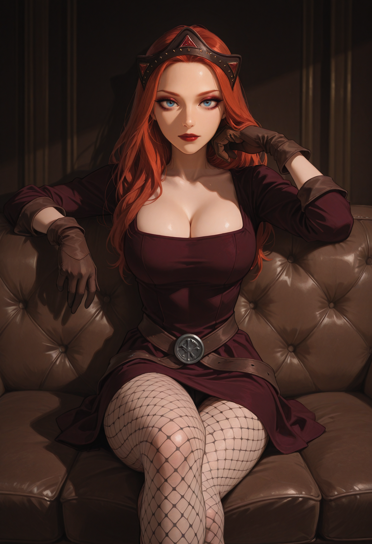 outfit tags: dress, cleavage, gloves, crown, fishnet pantyhose, pantyhose, fishnets, boots,
