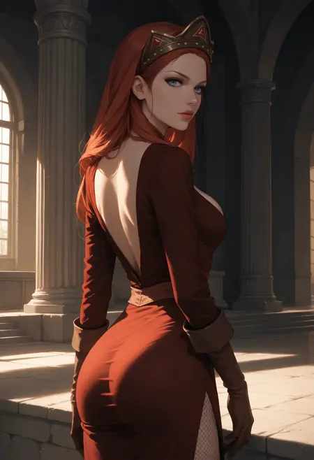 outfit tags: dress, cleavage, gloves, crown, fishnet pantyhose, pantyhose, fishnets, boots,