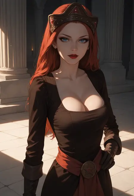 권장 태그: 1girl, solo, long hair, red hair, blue eyes, medium breasts,