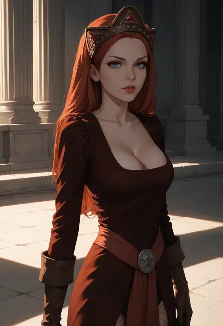 recommended tags: 1girl, solo, long hair, red hair, blue eyes, medium breasts,