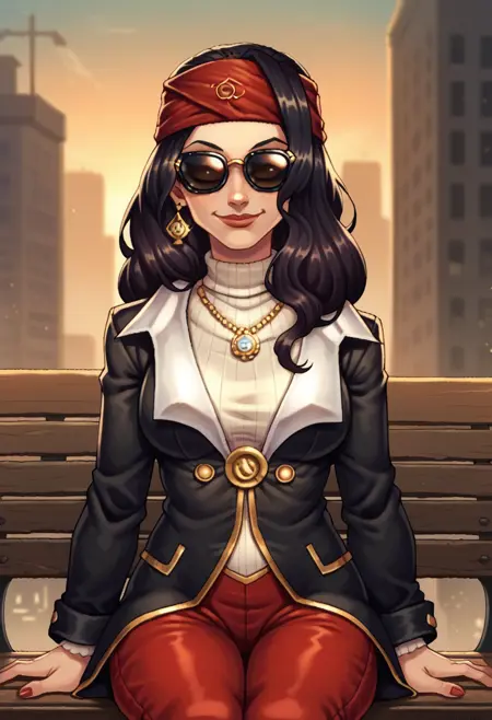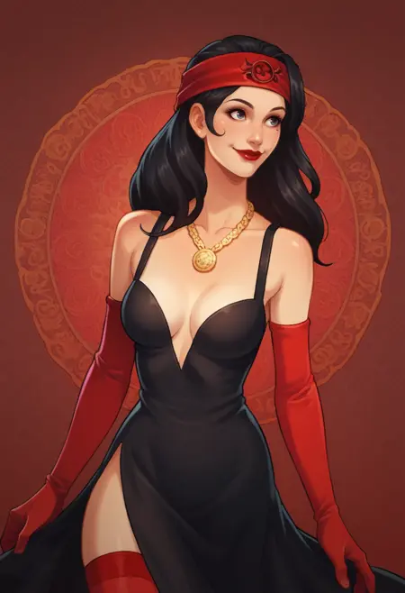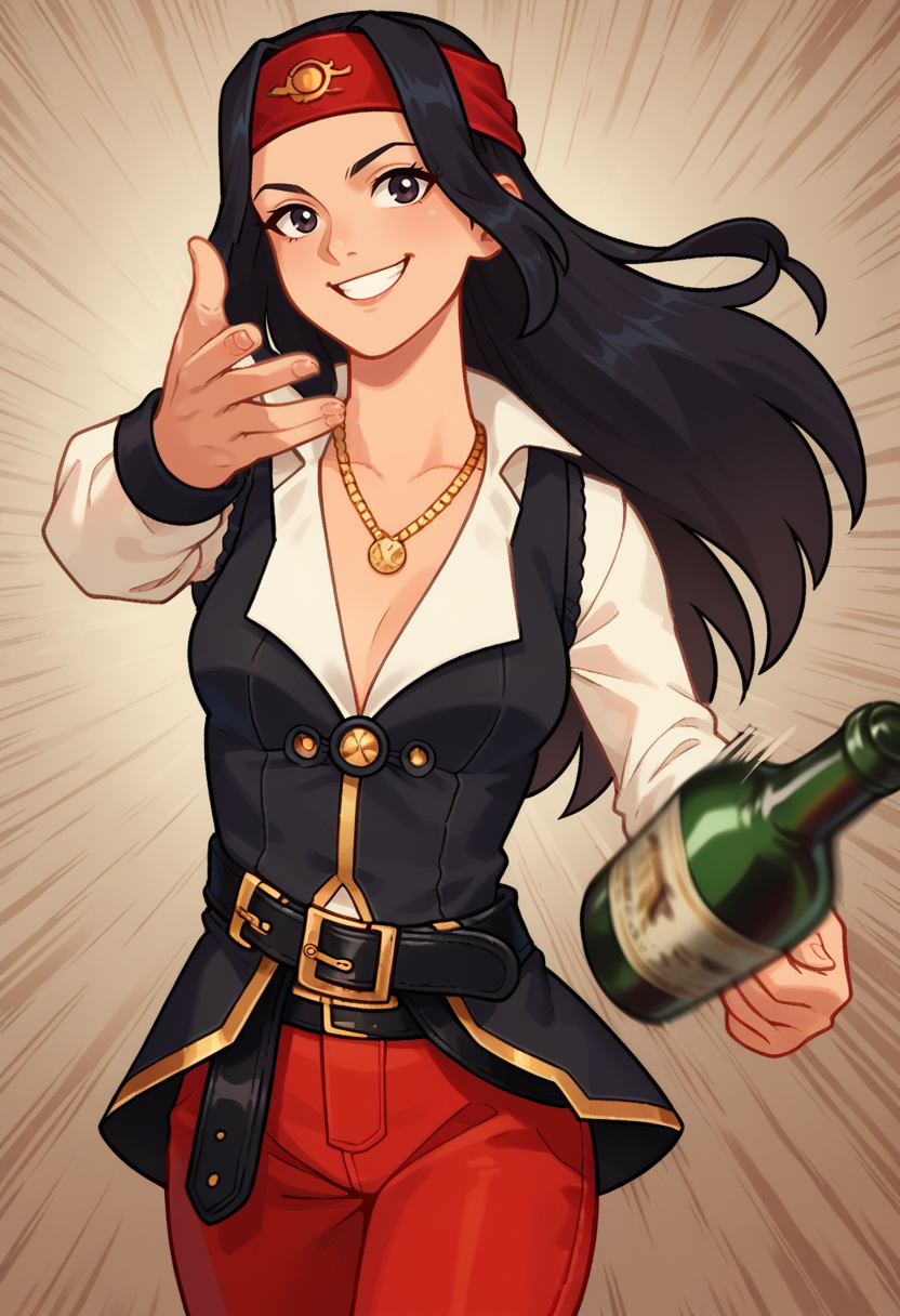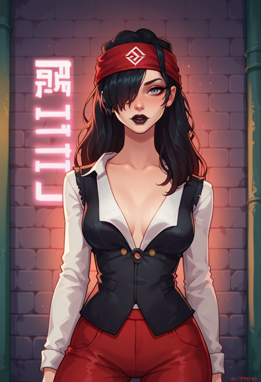 복장 - 빨간 헤드밴드, 검은 베스트, 흰 셔츠, 목걸이, 빨간 바지, 검은 부츠,