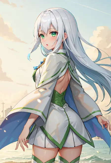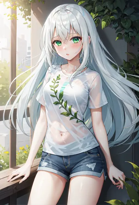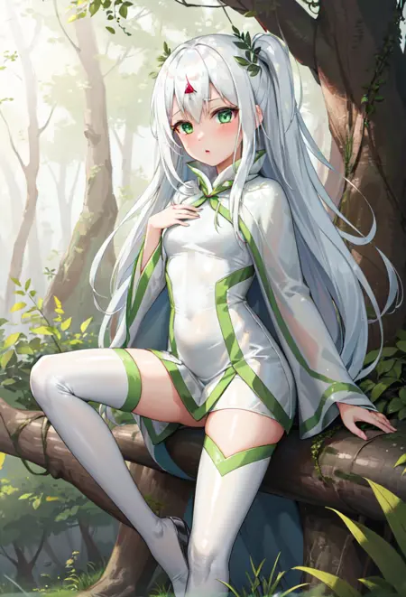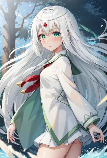 Appearance tags: white hair, hair ornament, long hair, green eyes