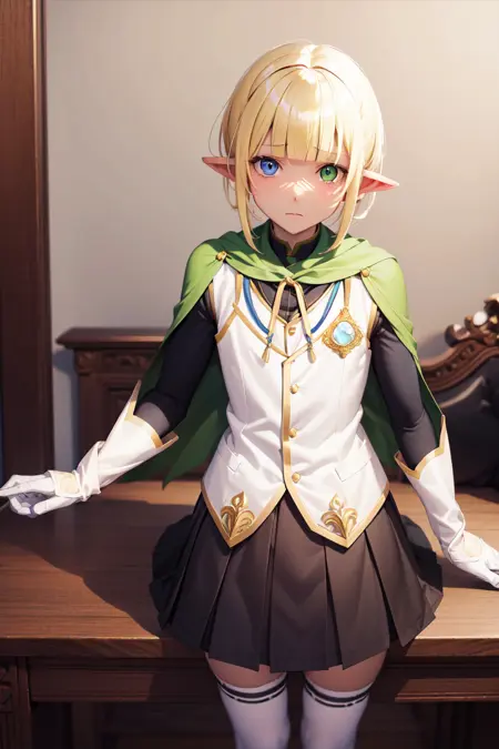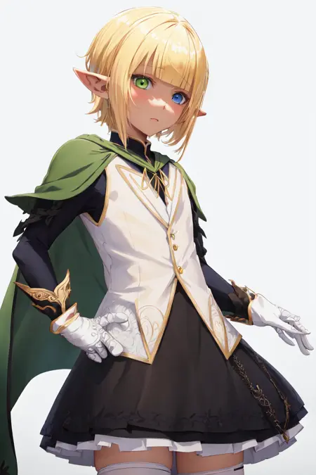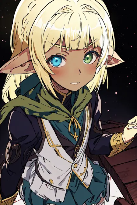 - "pointy ears, heterochromia, blonde hair, gloves, short hair, green eyes, blue eyes" 및 "red shirt, vest, long sleeves, brown gloves, elf, dark skin"