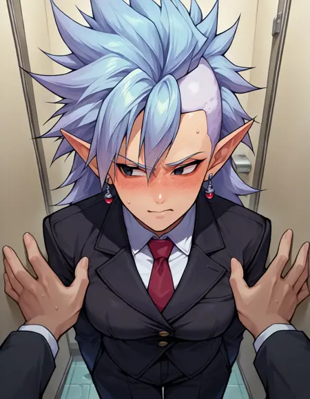 外观标签:长发,淡蓝紫色头发,尖刺状头发,莫霍克发型,黑眼睛,尖耳朵,红色耳环,波塔拉耳环