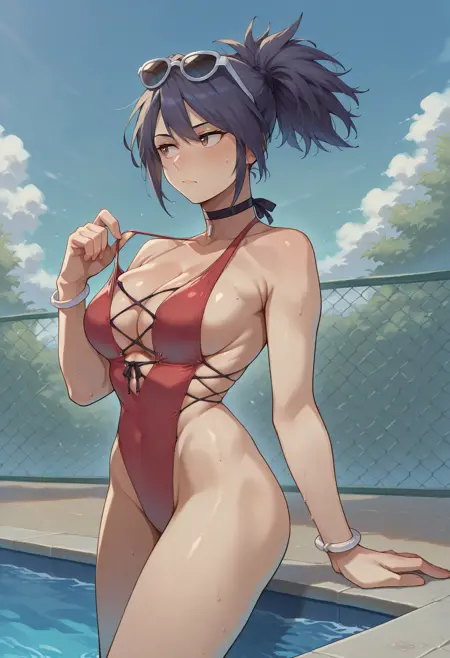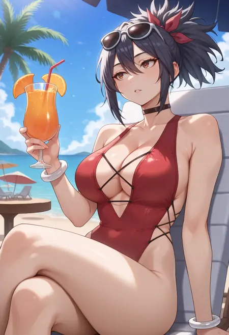 海滩女王: swmSheena,黑发,马尾,发带,短发,太阳镜,眼镜戴在头上,棕色眼睛,黑色项圈,红色连体泳装,裸露肩膀,交叉绑带服装,胸露,侧露装,侧乳,高开衩,白色手链