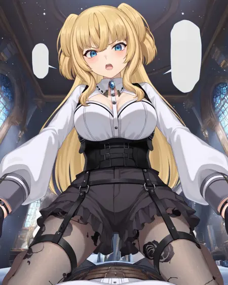 衣装パーツ:コート、クリーヴェージ、ハーネス、ミニクラウン、ショートパンツ、(frills:0.5)、パントイズ、ローズパターン、膝上ブーツ、ブーツリボン、リボン、ベルト、宝石、武器、ナイフ