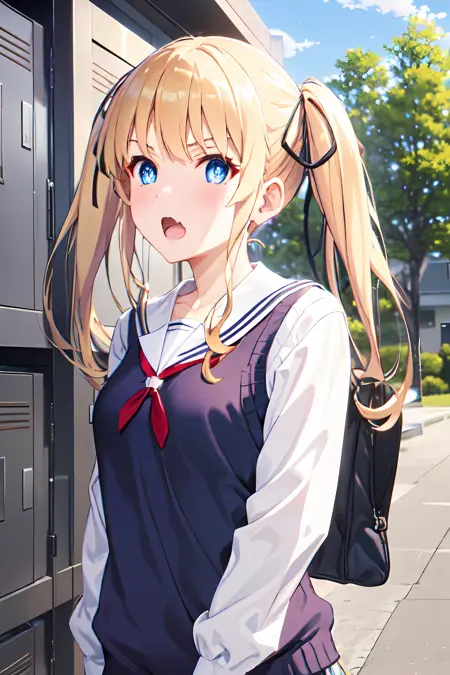 校服: ph_eriri, sawamura spencer eriri, 1girl, blonde hair, blue eyes, school uniform, twintails, solo, fang, long hair, hair ribbon, locker, anime coloring, parody, serafuku, blush, bangs, sweater vest, black ribbon