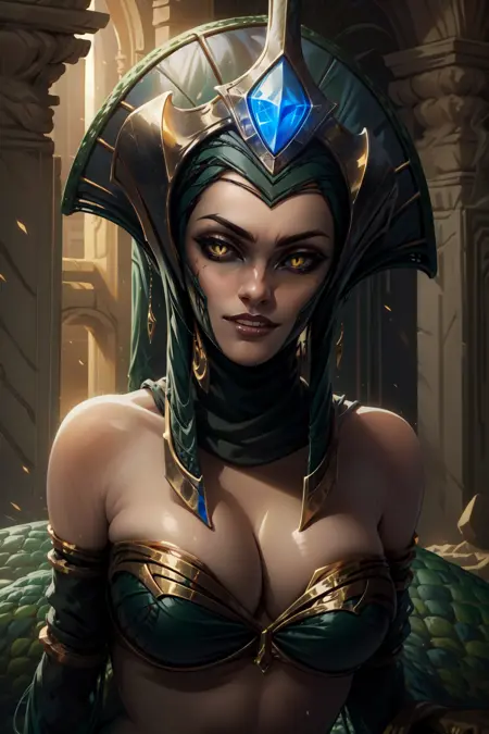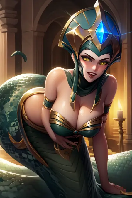 태그: cassiopeia (league of legends), 1girl, lamia, cleavage, helmet