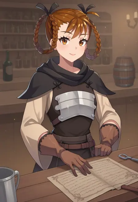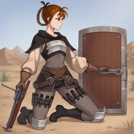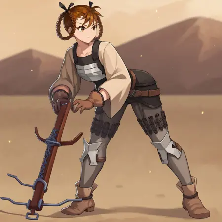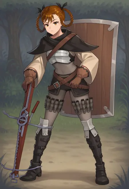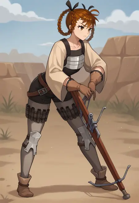 arbalist armor, steel breastplate, baggy sleeves, leather gloves, black shorts, shorts straps, gray pants, thigh accessories, steel poleyns,
