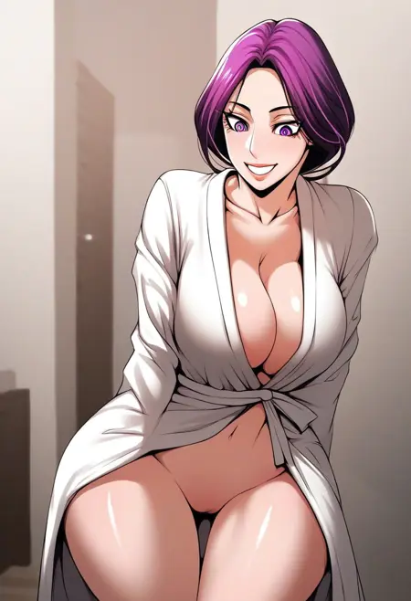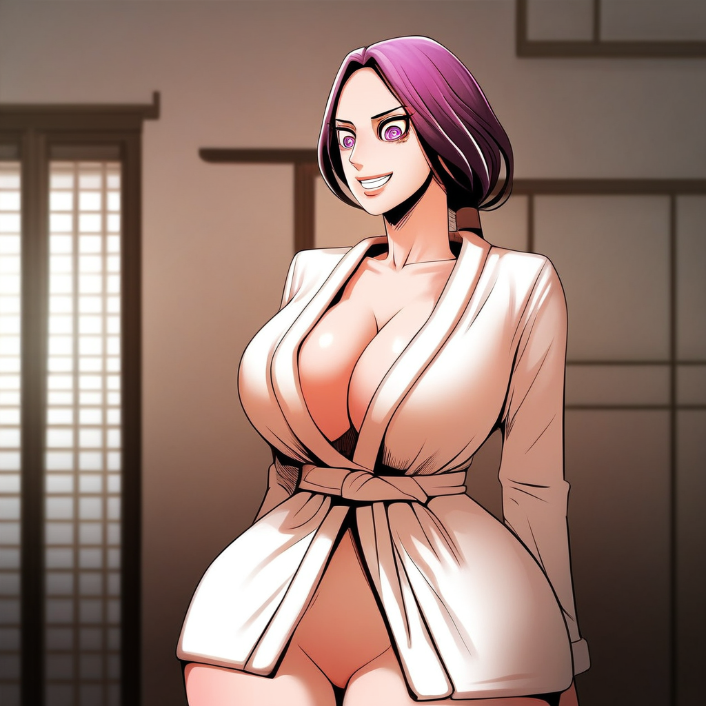 효정: hyo-jung, 날카로운 보라색 눈, 아름다운 보라색 머리카락, 긴 낮은 단발머리, 머리끈, 거대하고 허스키한 가슴,