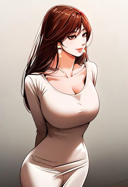 오유라: oh_yu_ra, 아름다운 호박색 눈, 아름다운 갈색 머리카락, 아름다운 긴 머리, 앞머리, 거대하고 허스키한 가슴,