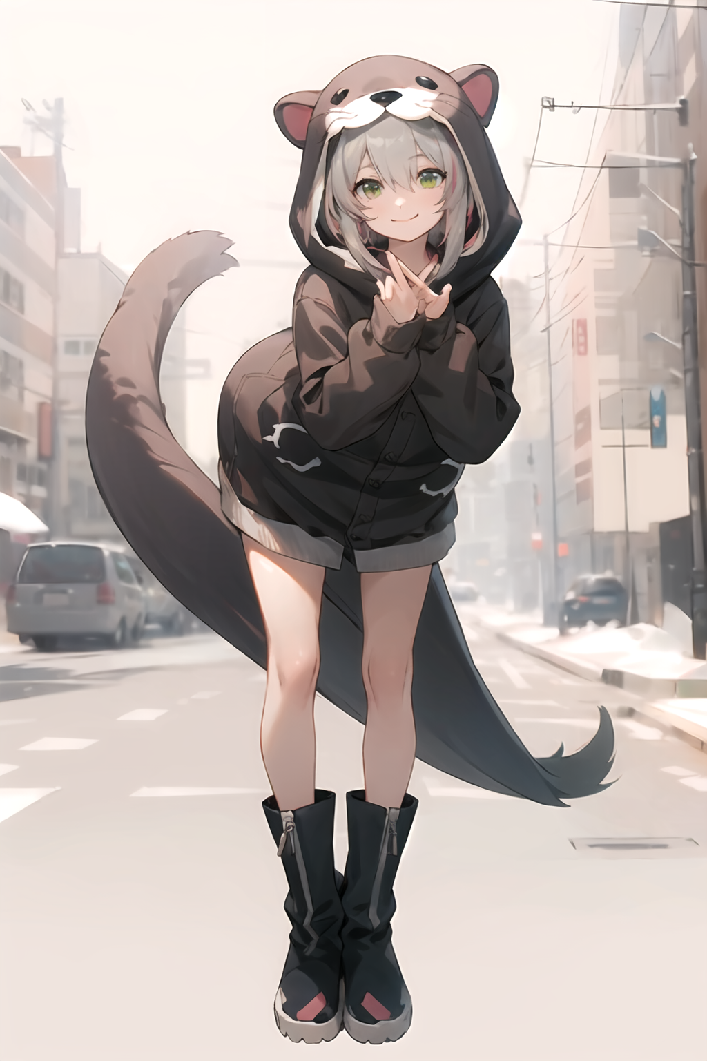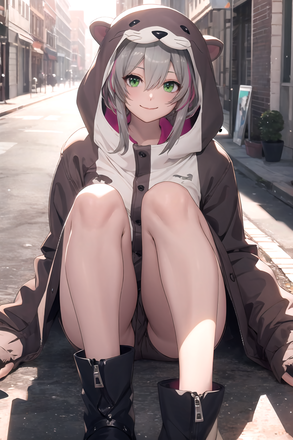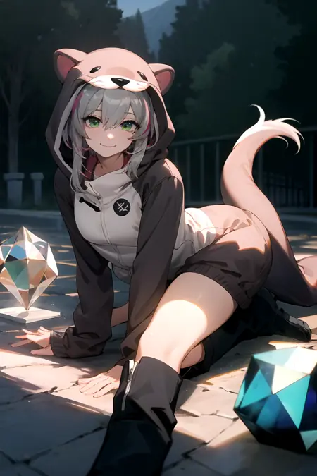 hair between eyes, green eyes, tail, pink hair, gray hair, grey hair, boots, hood, black footwear, streaked hair, animal hood, animal costume,