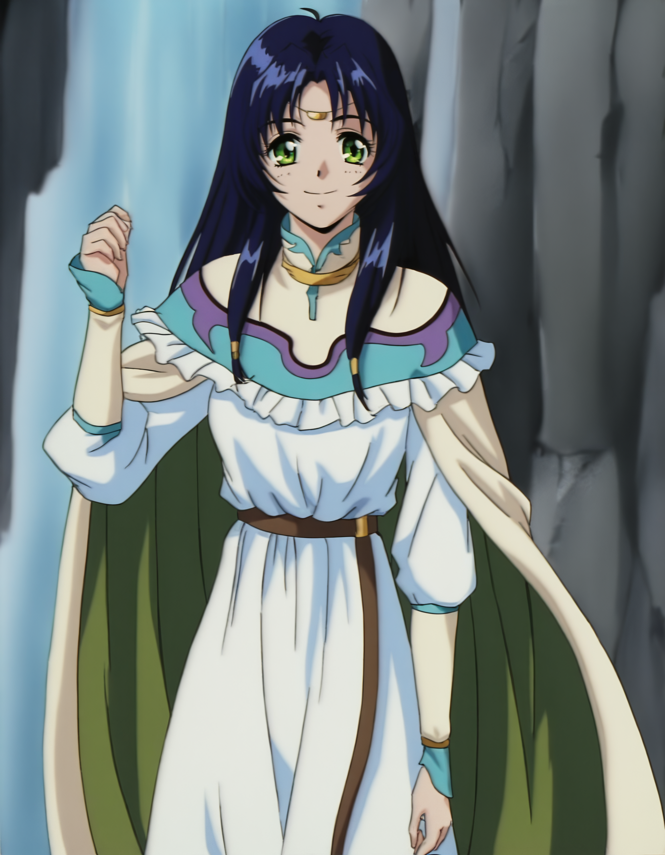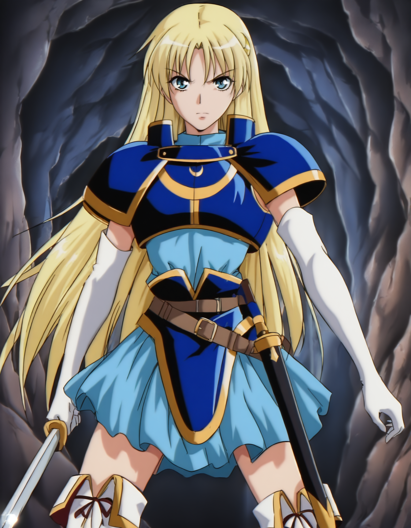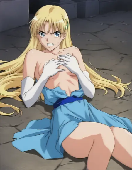 sharon, crescent hair ornament, white elbow gloves, blue dress, breastplate, belt, faulds, thigh bootssharon, crescent hair ornament, white elbow gloves, blue dress, bare shoulders, belt, faulds, thigh bootssharon, crescent hair ornament, white elbow gloves, blue dress, bare shoulders, open clothes, no bra