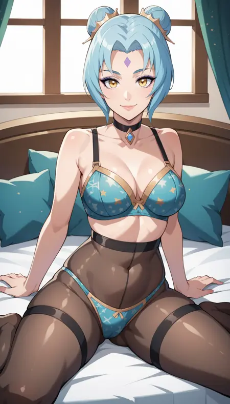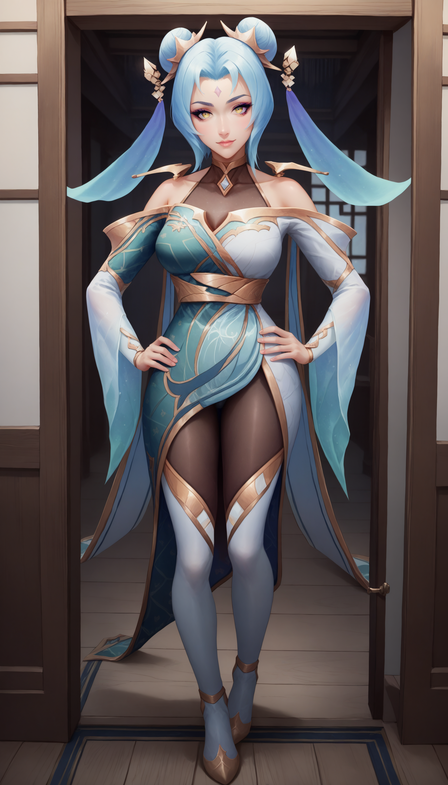 prestige immortal journey sona, score_9, 1girl, short blue hair, hair ornament, bangs, hair bun, pantyhose, light blue thigh boots, long wide sleeves, multicolored chinese dress, bare shoulders, collarbone, forehead mark, yellow eyes, makeup, choker, long hair ribbons, cape,