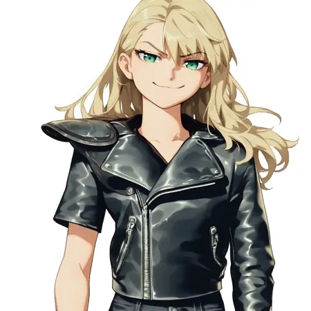 프롬프트: trwjkt, 가죽 재킷, 비대칭 옷, 비대칭 소매, 한쪽 어깨 패드, 지퍼, 지퍼 풀탭, (V1: trwjkt를 Road_Wargear로 바꾸거나, 그냥 빼고 가죽 재킷만으로 충분히 표현하세요)