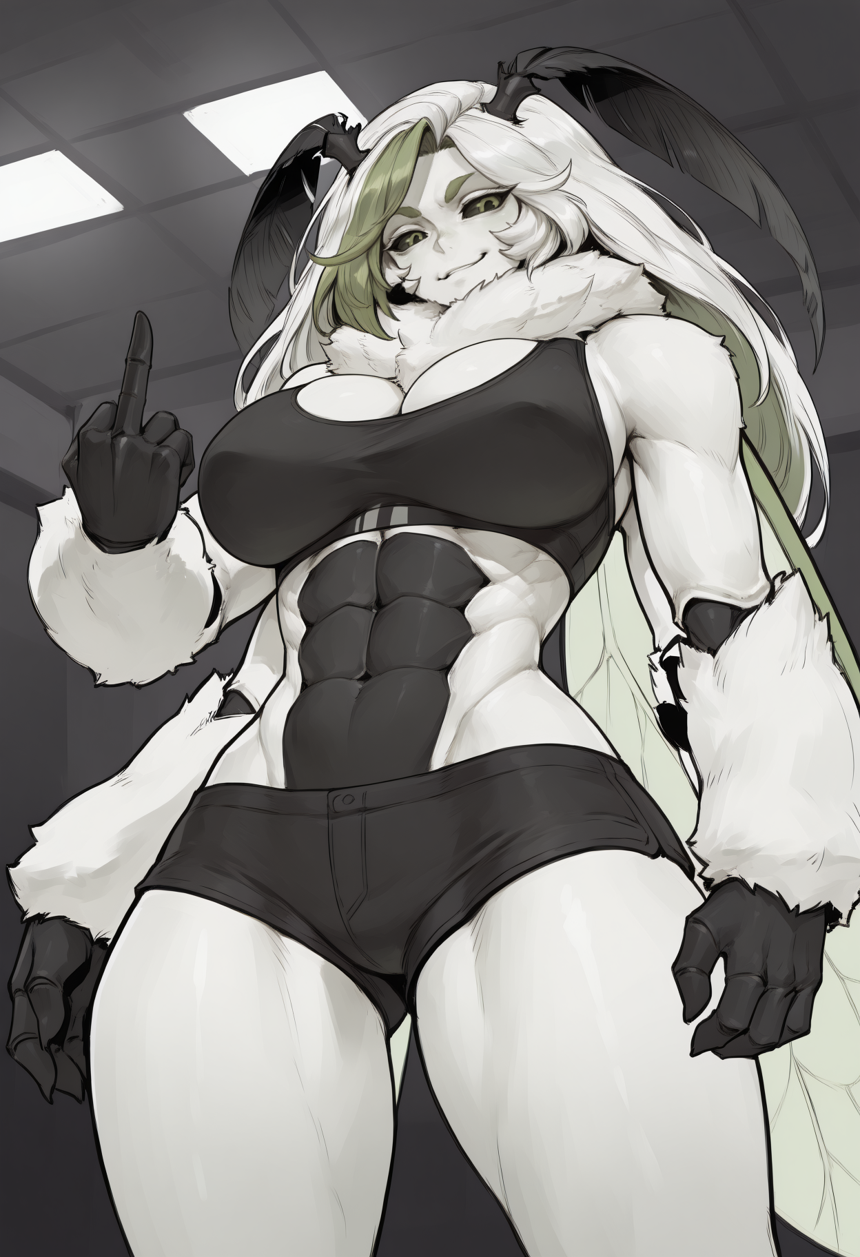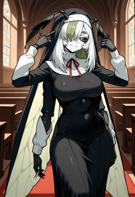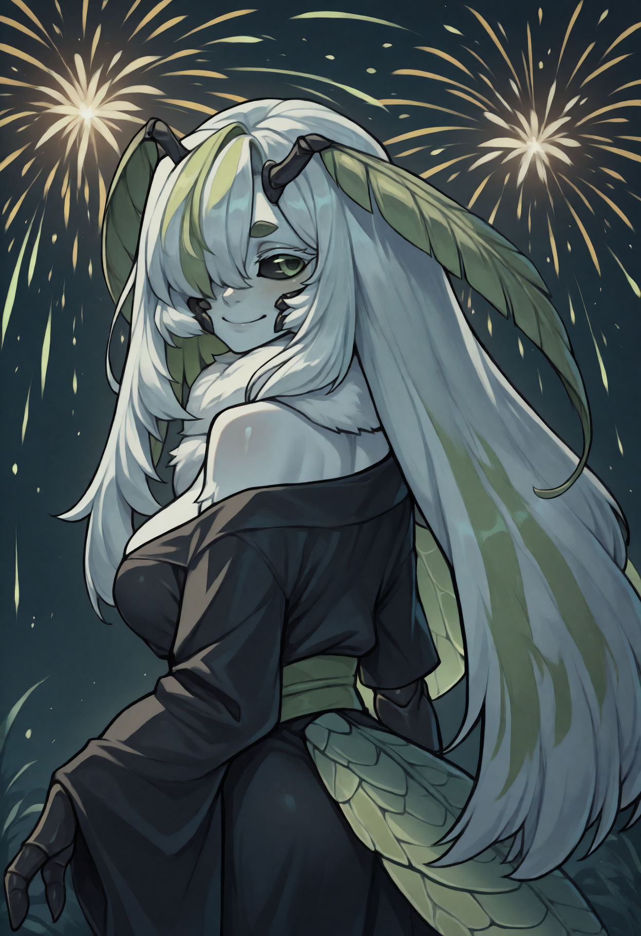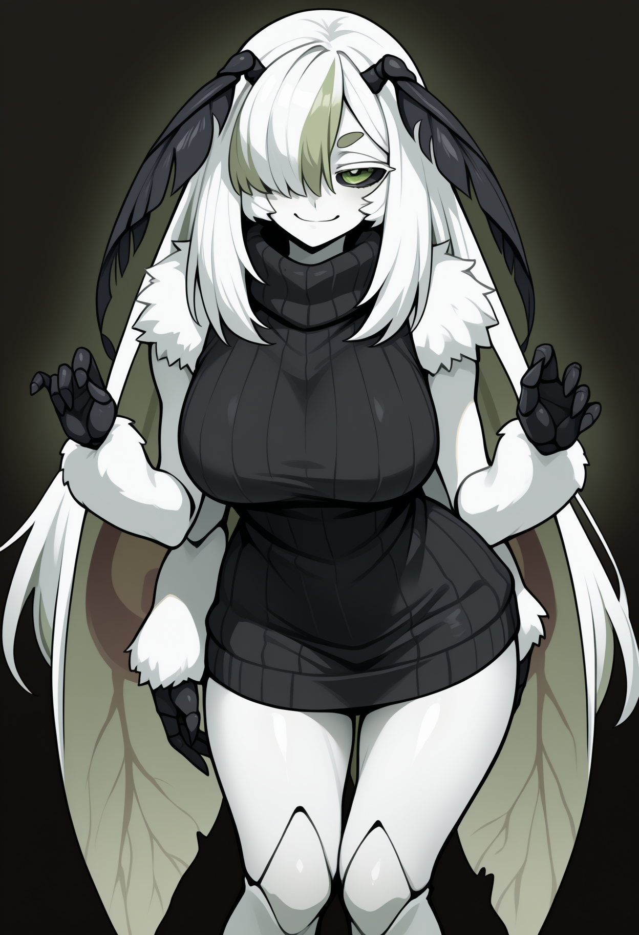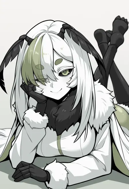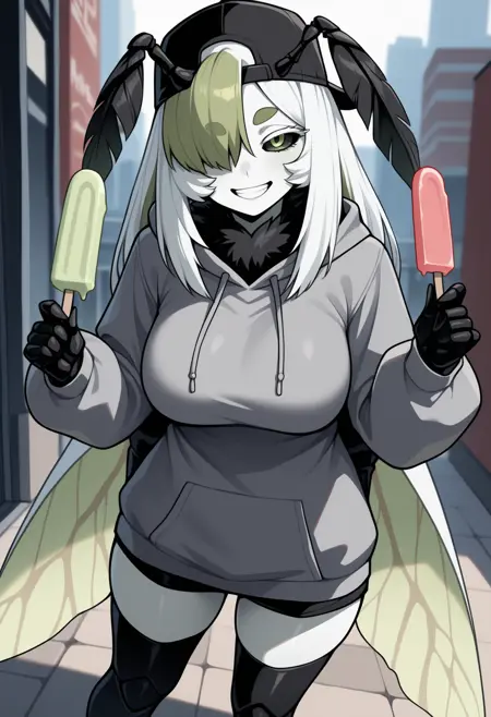 트리거 + 외모: juniperactias, 몬스터 걸, 절지동물 소녀, 나비 소녀, 하얀 피부, 곤충 날개, 추가 팔, 손가락 수 감소, 외골격, 긴 머리카락, 다색 머리카락, 하얀 머리카락, 녹색 머리카락, 한쪽 눈을 가리는 머리카락, 귀촉, 녹색 눈, 검은 공막, 큰 가슴