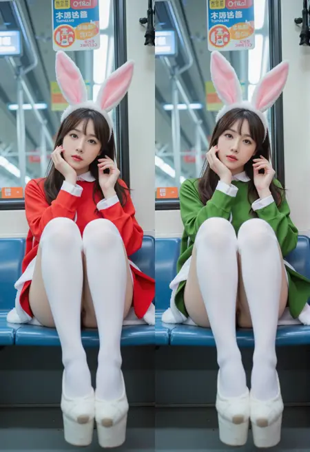 プロンプト:A diptych with two side-by-side images of the same scene. On the right, the scene is exactly the same as on the left but {Women's naked,Wearing sunglasses,facemask}