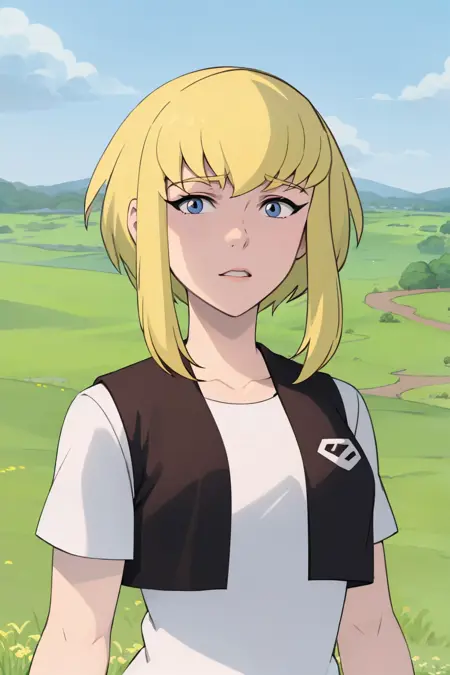 Basic prompts : 1girl, karazorel, blonde hair, blue eyes, short hair