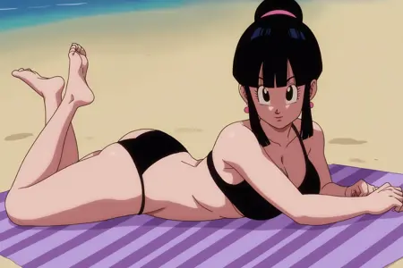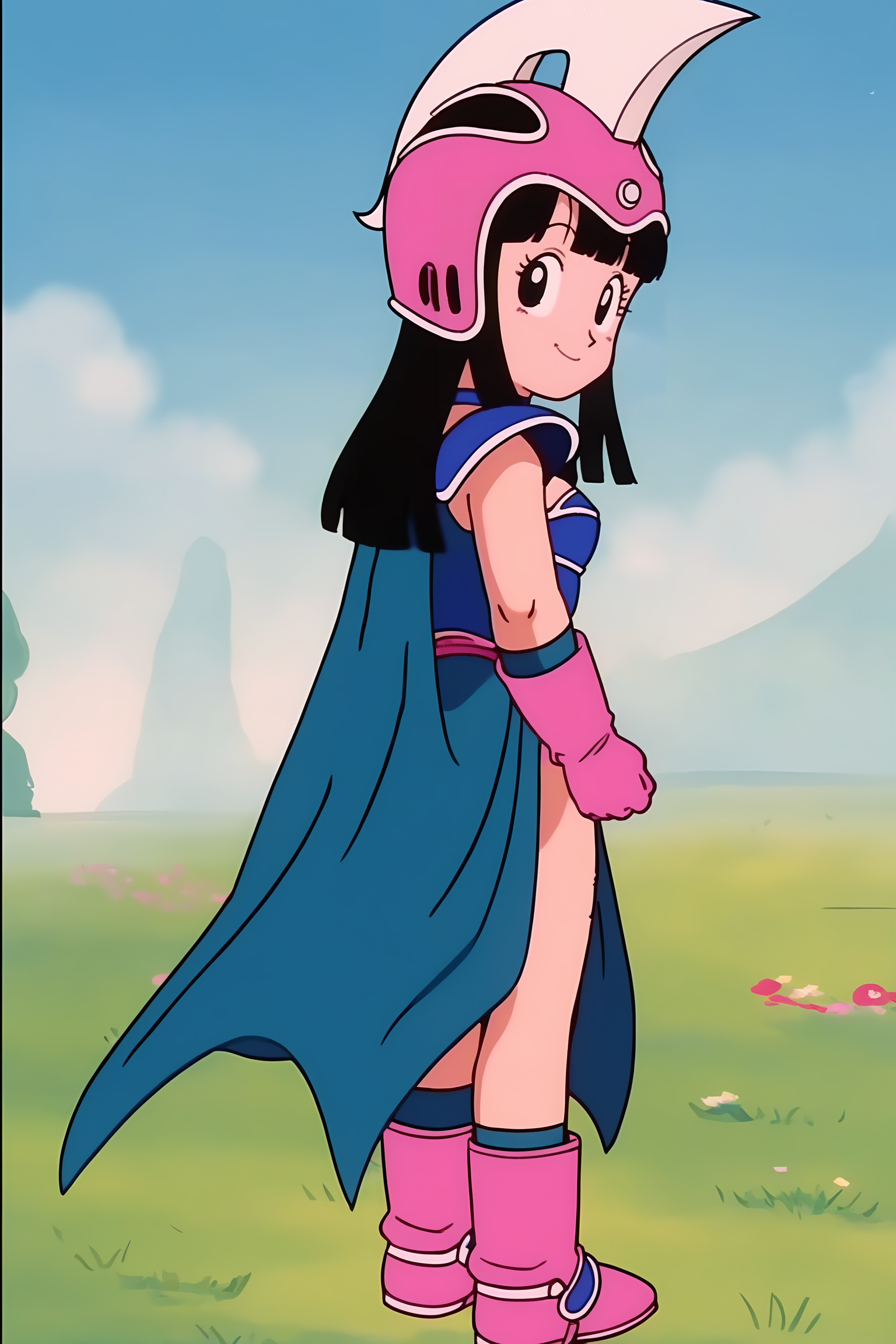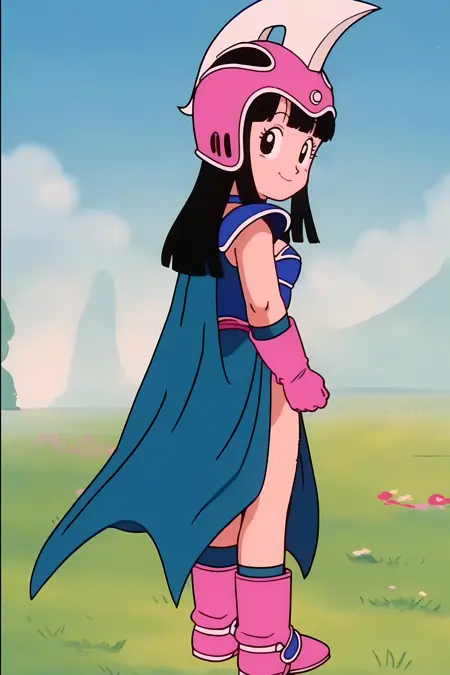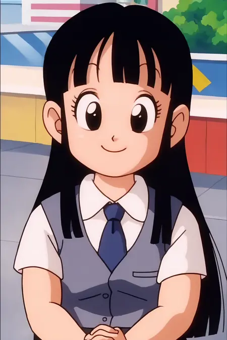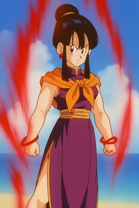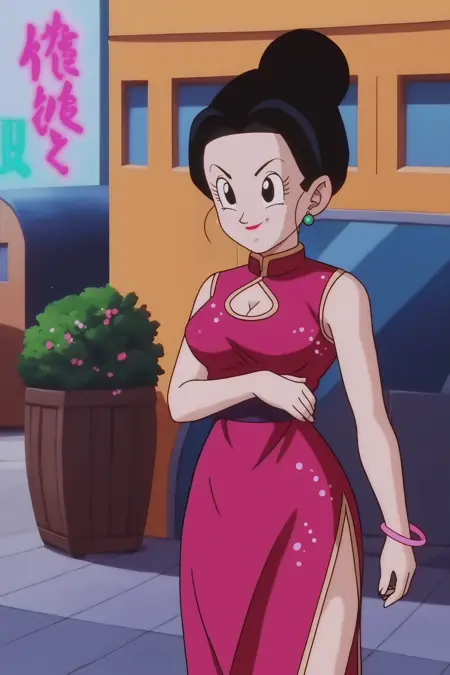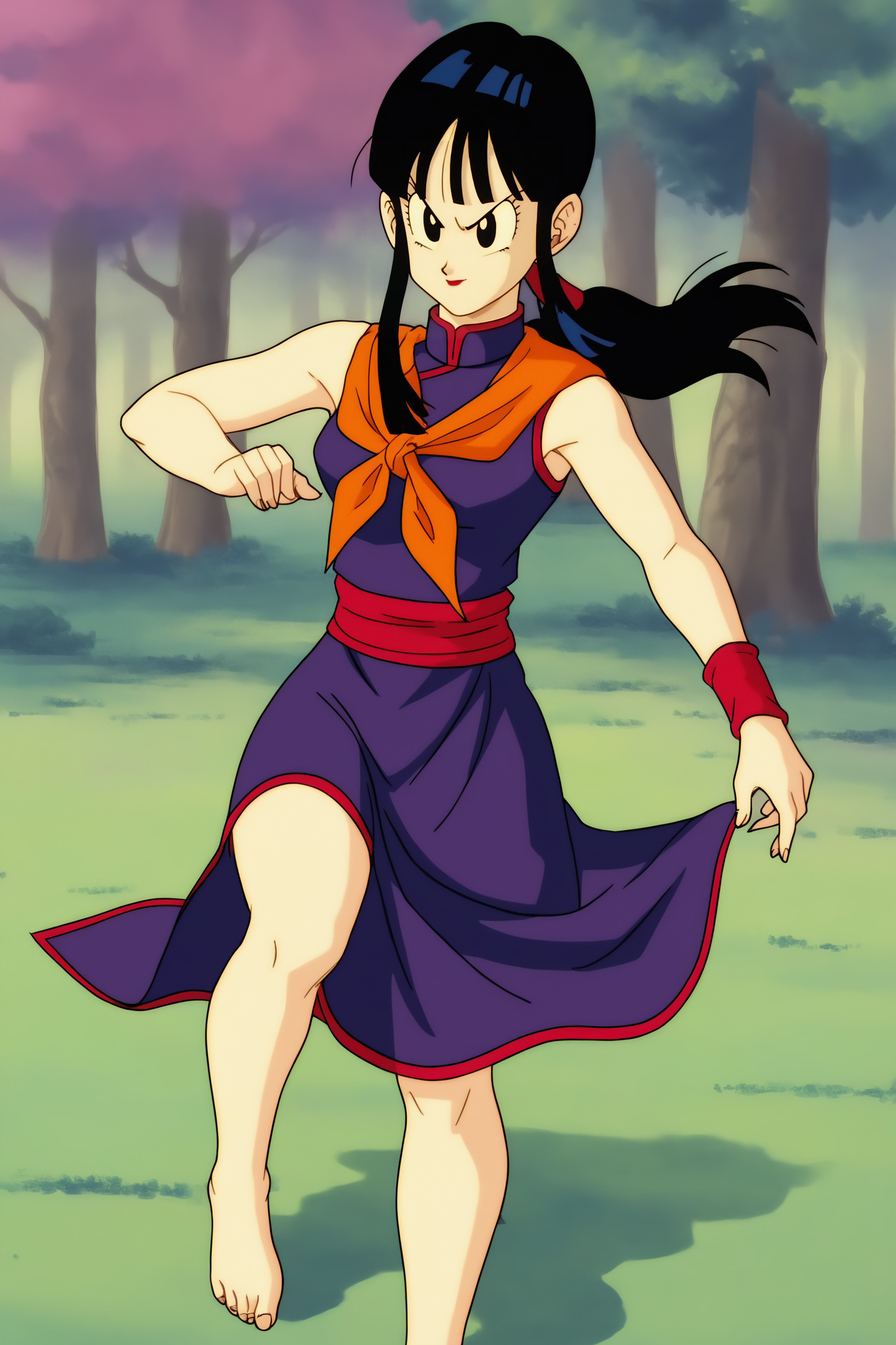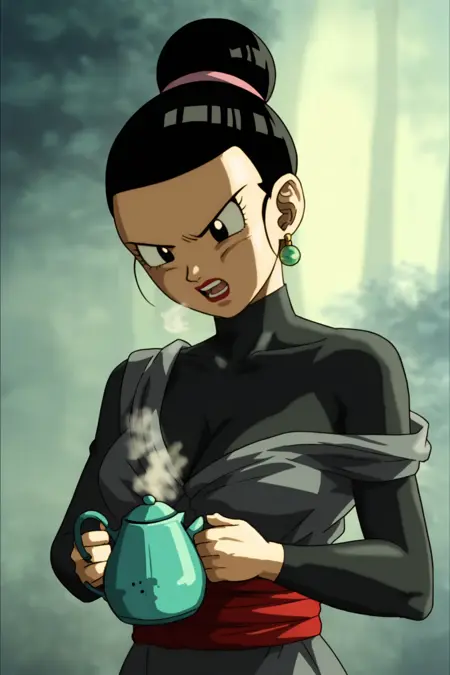 chi-chi, DBZ, end of buu, alternate hairstyle, parted bangs, black hair, black eyes, single hair bun,
