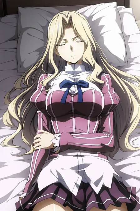 其他提示:金发、长发、蓝眼睛、大乳房、粉红色短裙、超短裙、连裤袜、绝对领域、白色过膝袜、破烂衣物、胸部露空、服装镂空