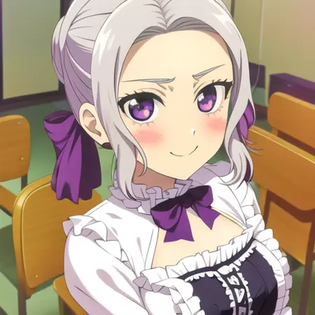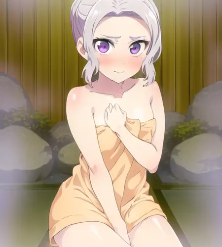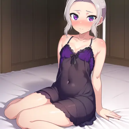 Tags which work particularly well with this model include, dress, close-up, towel (and other derivatives such as towel slip, check on danbooru for more), smile, happy, angry, mouth open, teeth, mouth closed, eyes closed, blush, nose blush, onsen (along with bamboo and fence to get the same scenery as the anime), frills (and other frills derivations), nightgown (and derivatives such as lingerie, negligee), cat ears, headband, maid, enmaidened, hand on own chest, looking at viewer, breasts, small breasts, nipples, nude, nsfw (part of parent model), pussy, legs spread, bare shoulders, upper body, bow, hair bow, purple bow, hair ornament, ribbon, naval, collarbone, flat chest (I recommend this tag for more realistic results to the character proportions), partially submerged (for onsen), steam, steam censor, water (works great with onsen), face, grabbing own breast, naked towel, school uniform, cowboy shot, upper body (and similar ones), innertube, sun hat, bikini (color variants, styles such as frills, etc), bra, panties, halterneck, indoors, outdoors, straw hat, tile floor, tiles, standing, sitting, solo, classroom