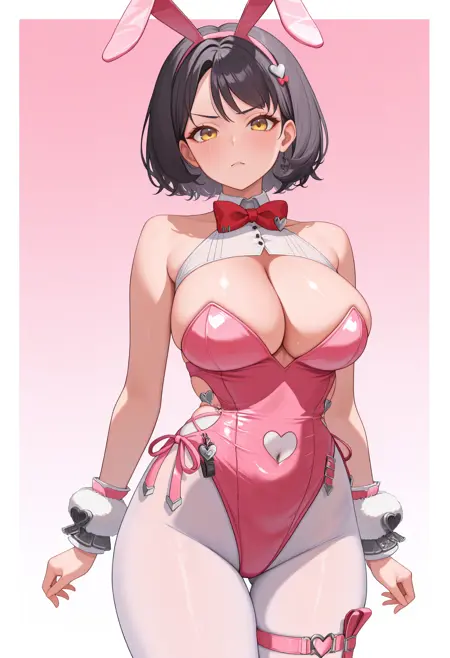 mlkbny,黄眼睛,黑发,短发,假动物耳朵,兔耳,发带,心形发饰,胸部,红色蝴蝶结,花花公子兔女郎,可拆卸领子,粉红色紧身衣,无肩带,侧系紧身衣,乳沟,肚脐开孔,心形开孔,白色连裤袜,大腿绑带,蓬松腕部护套