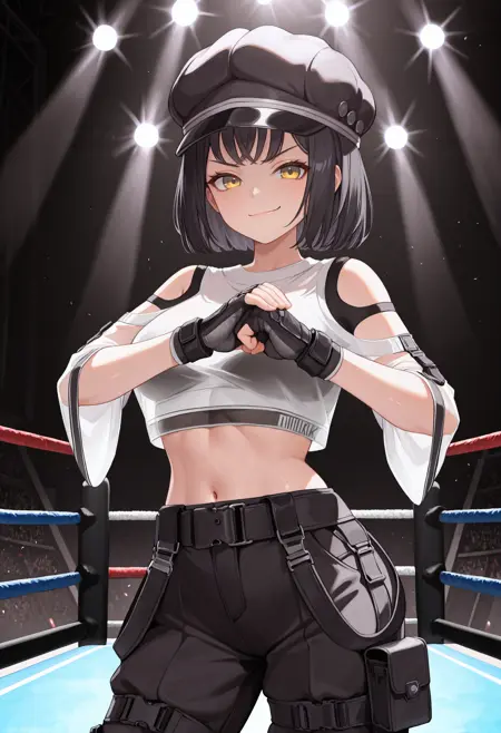 mlkdf,黄眼睛,黑发,短发,黑帽,出租车帽,胸部,白衬衫,露脐装,透视,肩部开孔,黑色运动内衣,肚脐,腹部,黑色长裤,髋部口袋,大腿口袋,腿部绑带,口袋,黑色腰带,黑色手套,露指手套