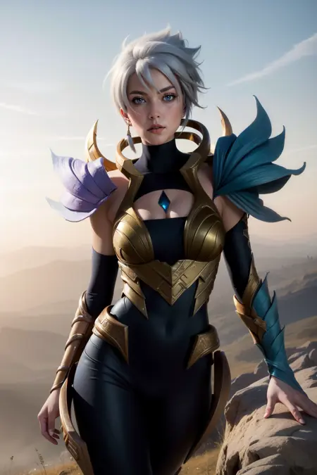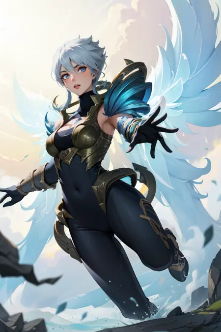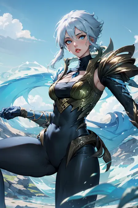 태그: dawnbringer riven, 1girl, bodysuit, armor, white hair, short hair