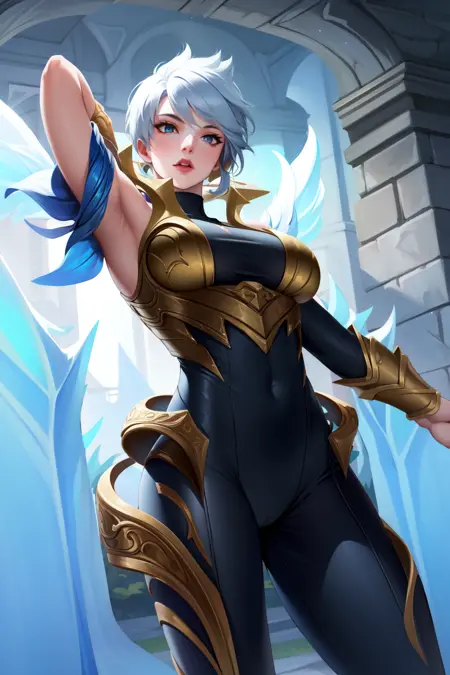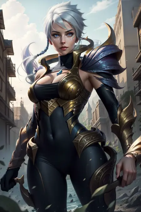 标签:dawnbringer riven, 1girl, bodysuit, armor, white hair, short hair