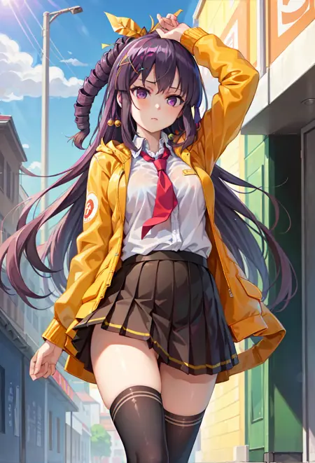 Casthour clothes: (casthour:1.2), orange jacket, skirt, hair ornament, school uniform, black thighhighs