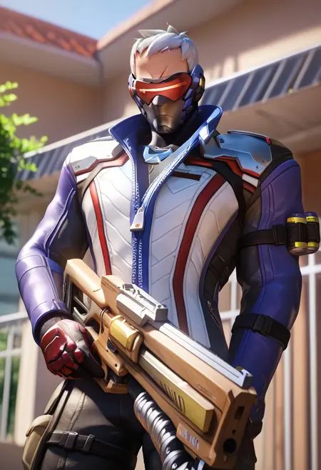 - Overwatch 2 Soldier: 76 아트 생성 - soldier: 76 \(overwatch\), new76, 매우 짧은 머리, 흰색 머리, 파란 눈, 얼굴 수염(ntl), 콧수염, 얼굴 흉터, 재킷, 검은 바지, 장갑, 부츠, 비저