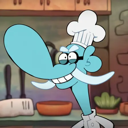 MungDaal, broad shoulders, mature male, black eyes, skinny, light blue skin, cartoon style, athletic build, big ears, big round nose, glasses, big white mustache, bottom heavy