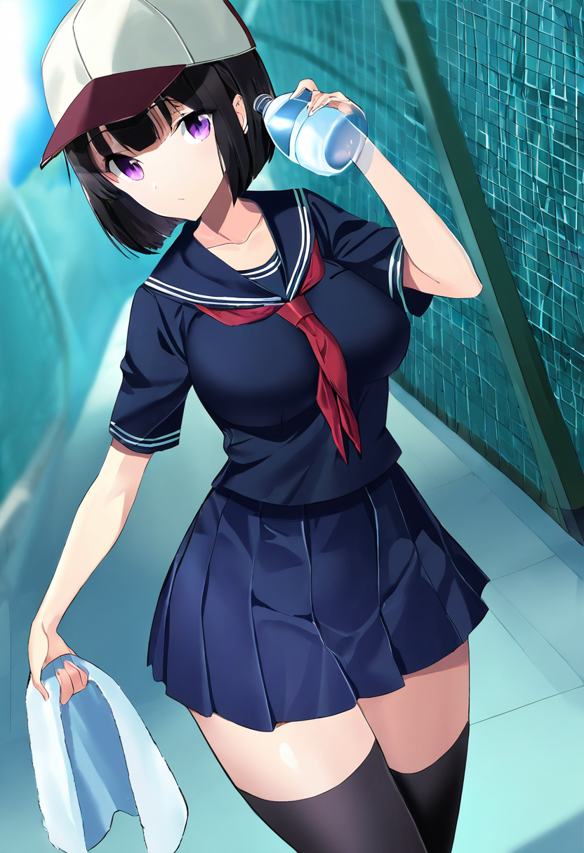 black hair,short hair,bob cut,purple eyes,school uniform,serafuku,sailor collar,red neckerchief,black thighhighs,blue skirt,pleated skirt,zettai ryouiki,collarbone,large breasts,