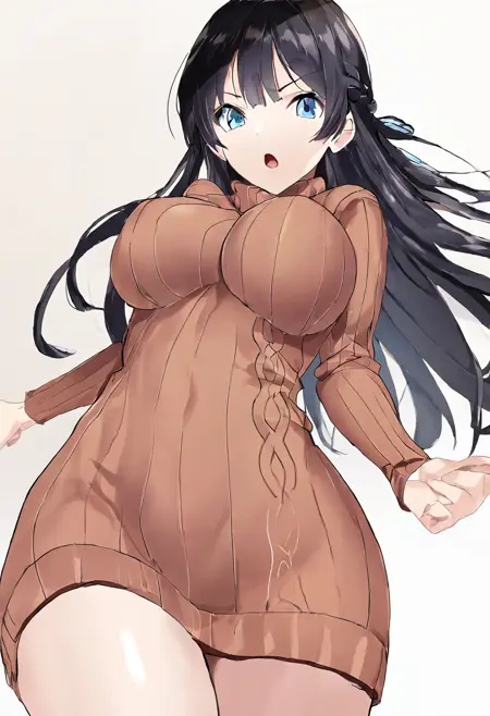 long hair,black hair,braid,blue eyes,brown sweater,sweater,ribbed sweater,turtleneck,sweater dress,impossible clothes,large breasts,