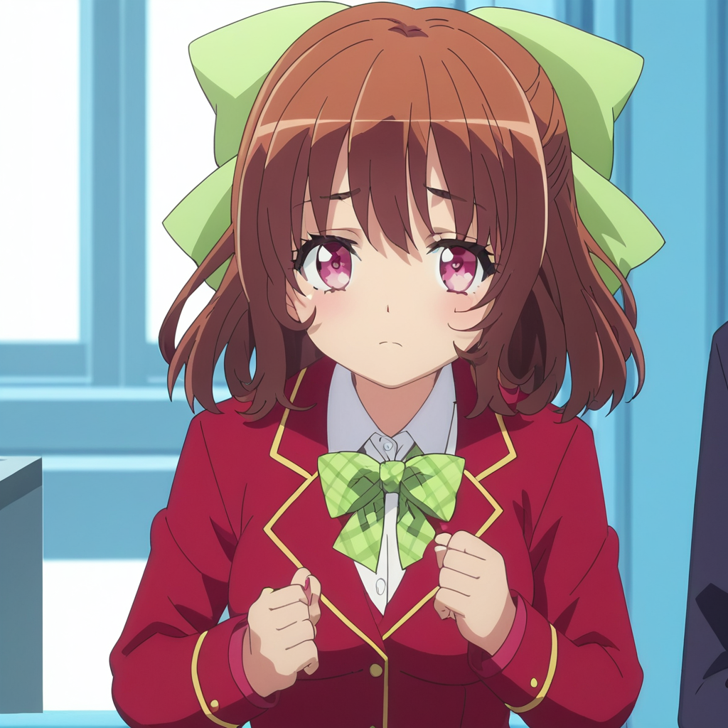 1girl, green bow, bow, solo, brown hair, medium hair, pink eyes, hair bow, jacket, school uniform, brown hair, red jacket, blazer, plaid bow, green ribbon