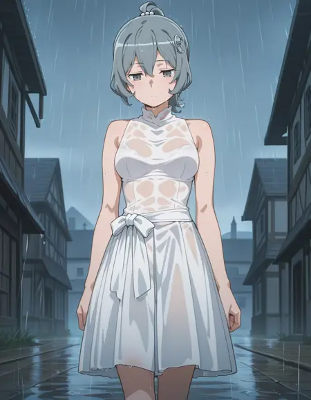 <lora:syr_flova-danmachi_s5-ixl-anime-soralz:1>, syr flova (danmachi), 短发, 灰发, 马尾辫, 发丝遮眼, 灰色眼睛