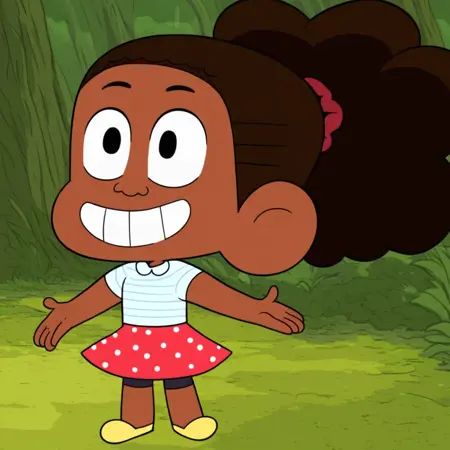 トリガー単語:1girl, Solo, Jessica_Cotc, 黒い目, 茶色の肌, 黒い眉, 濃い茶色の髪, 赤い髪バンド, ヘアスタイル:大きくふわふわしたポニーテール, 青い縞模様の白いシャツ, 白いドット模様の赤いスカート, 黒いショートパンツ, 黄色い靴, 大きな目, 小柄