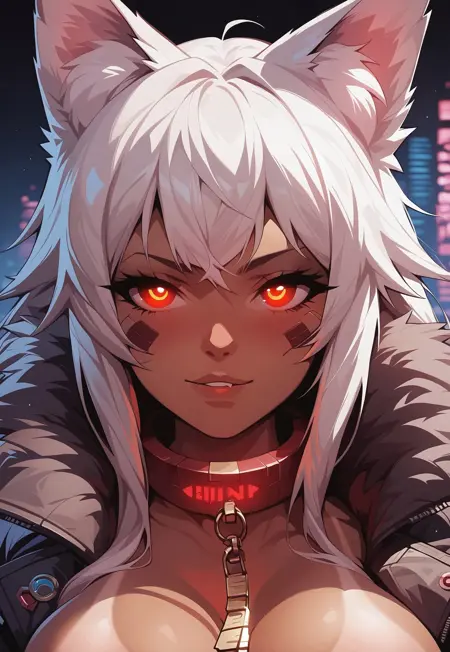 Iconic Character Design: Short platinum hair with wolf ears, red cybernetic eyes, and a confident stance that reflects both her wild werewolf nature and her cutting-edge, cybernetic augmentation.