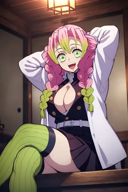 일상복용 프롬프트: 검은 셔츠, 라임색 허벅지 양말, 흰색 재킷, 흰색 벨트, 가슴 노출 컷아웃, 단추, 검은 미니 스커트
